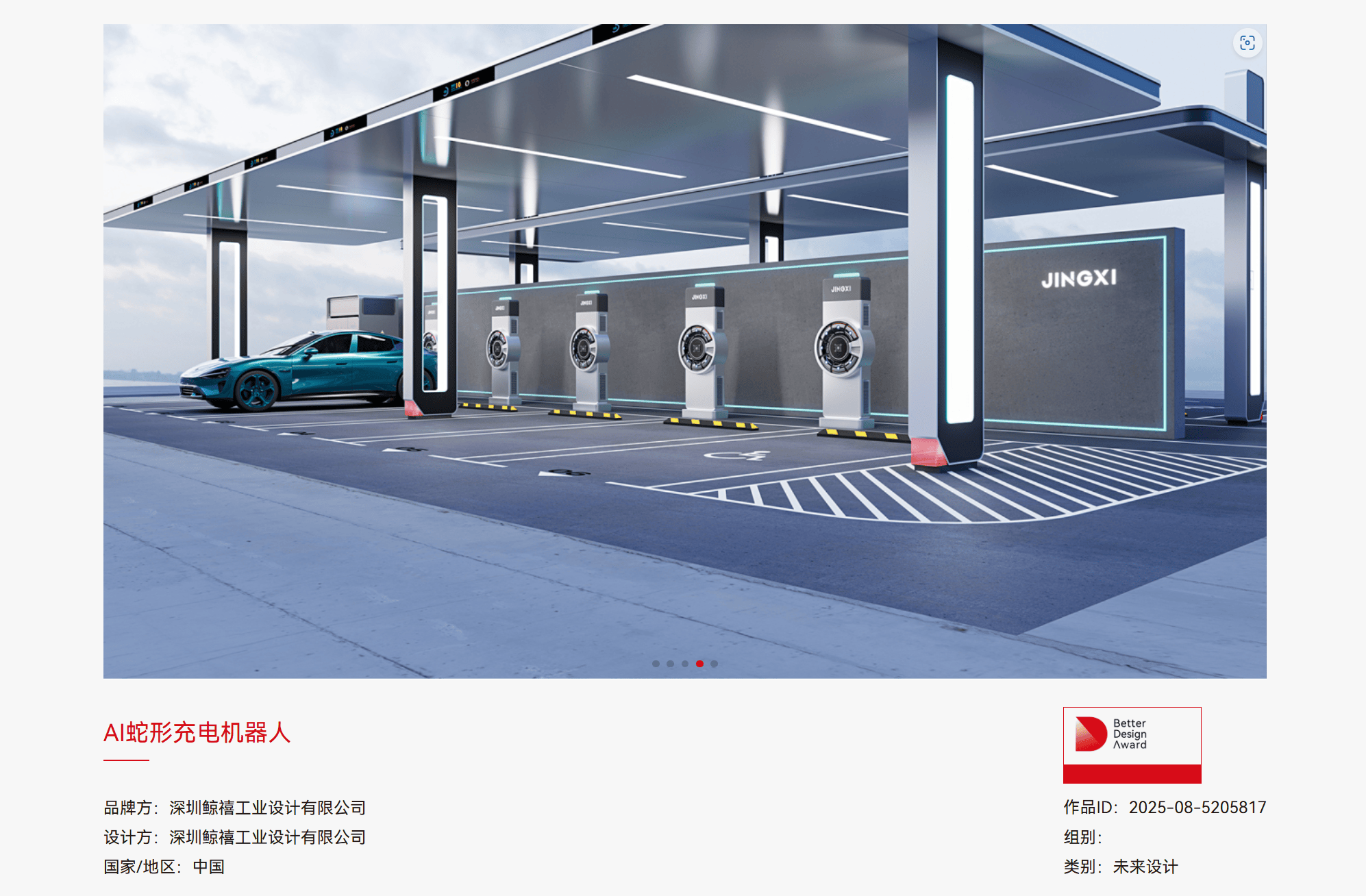 AI蛇形充电机器人:该设计在2025年备受瞩目的国际设计大赛中荣获BDA大奖。这款机器人不仅仅是一个充电设备,更是科技与美学相结合的典范,体现了未来智能交通的愿景。