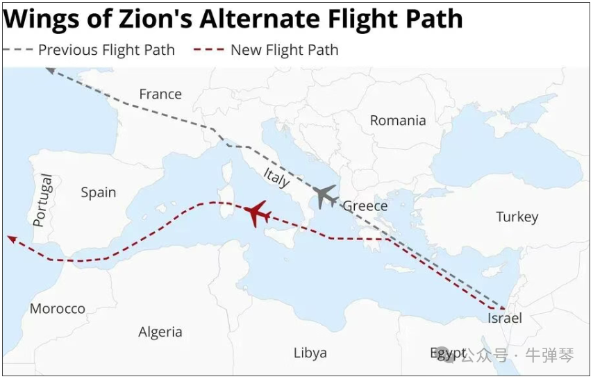 要知道,地球是圆的,以色列飞机出发去纽约,一般都向西北穿越欧洲的意大利、法国、西班牙……