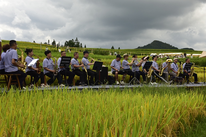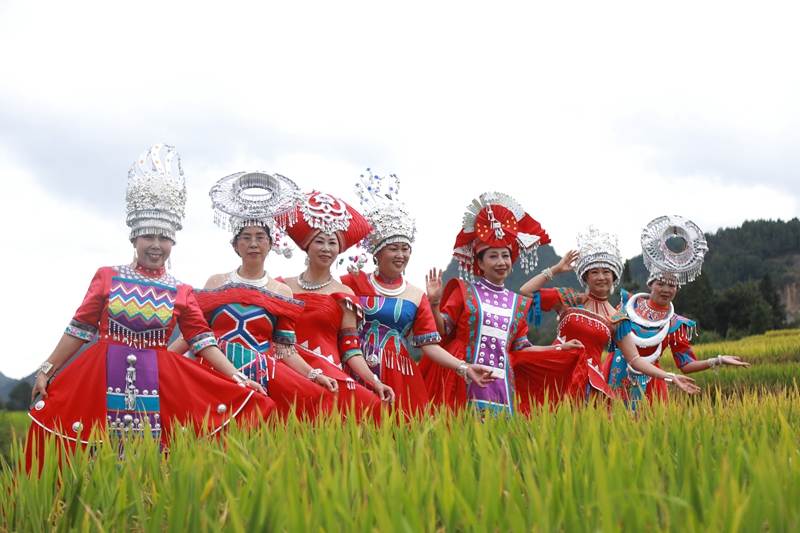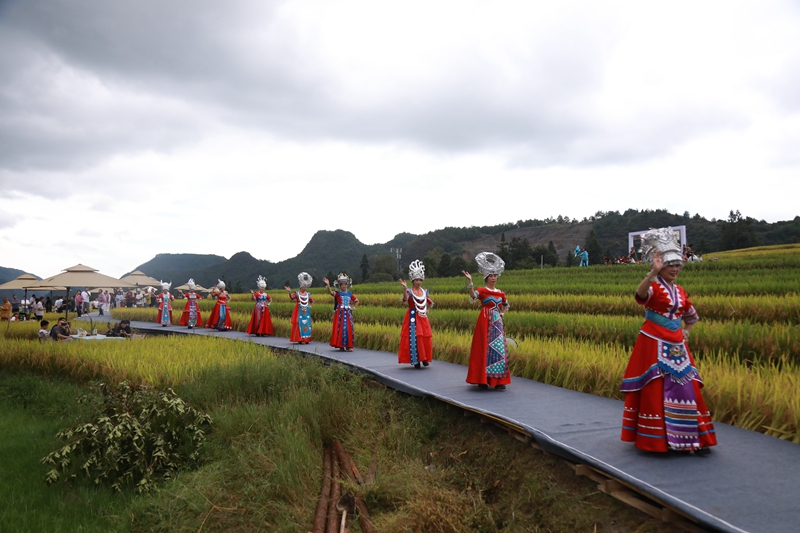 在田园艺术表演现场,层层叠叠的稻田变身天然T台,“模特”们踏着优美的步伐,行走在蜿蜒的田埂上,身后是金灿灿的待收稻谷,眼前是绚丽的民族服饰,自然与人文在田间完美交融,构成一幅流动的丰收画卷。