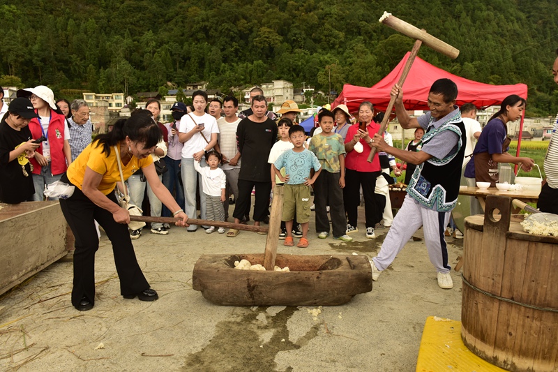 “打稻谷、打糍粑、剥包谷”组成的农事体验“铁人三项”吸引了众多游客参与。大家体验着最原始的稻谷脱粒方式,齐心协力捶打香甜糍粑,手指翻飞快速将玉米粒脱棒,亲身体验传统农耕文化的魅力。